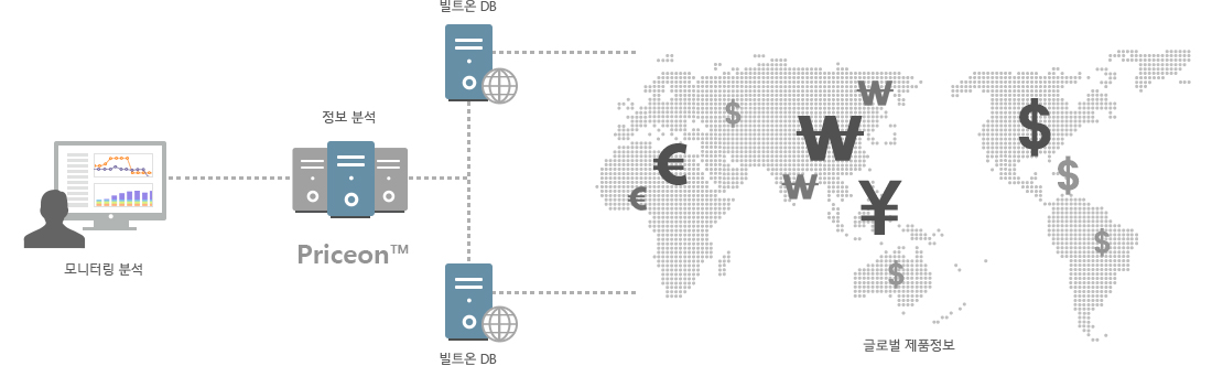 Priceon은 글로벌 온라인마켓에서 자사 및 경쟁사 상품(SKU)의 판매가격, 할인가격, 배송가격 정보를 모니터링, 분석하여 실제 판매되고 있는 상품의 글로벌 가격구조를 파악하고 자사 상품판매 가격정책을 수립할 수 있도록 합니다.